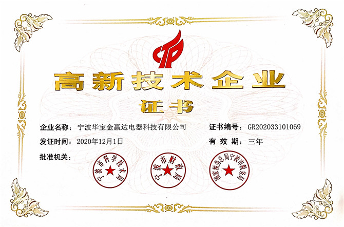 公司于近日收到由寧波市科學技術局、寧波市財政局、國家稅務總局寧波市稅務局聯合為我司旗下4家子公司:寧波國瑯機器人科技有限公司、寧波華寶百順模具制造有限公司、寧波貝凱日用品制造有限公司、寧波華寶金贏達電器科技有限公司,頒發的“高新技術企業”證書。