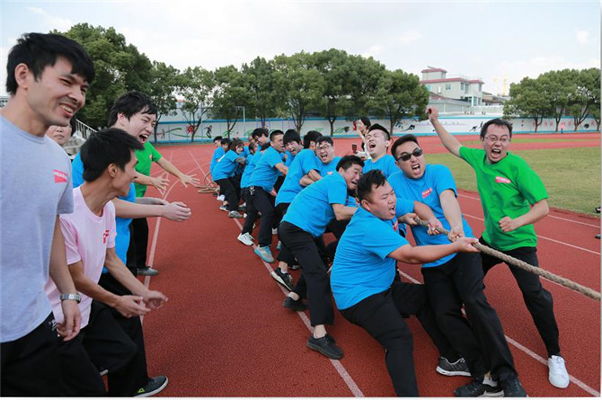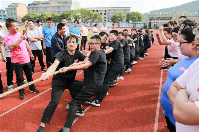 “拔河”作為運動會的壓軸項目,也是精彩萬分。每個參賽運動員們為了團隊榮譽用盡全身的力氣與對手頑強拼搏,特別是當雙方勝負難分的時刻,盡管他們此時都已經大汗淋漓,身心疲憊,但是他們仍毫不退縮,而是咬緊牙關,堅持到底,從他們身上看到了頑強的毅力和拼搏精神。圍觀的運動員都變成了臨時啦啦隊,為正在參賽的隊員吶喊助威。“拔河”比賽充分體現了運動員們堅強,勇敢,團結協作的精神。經過多輪比賽,最終由模具產業隊獲得“拔河”單項比賽第一名。